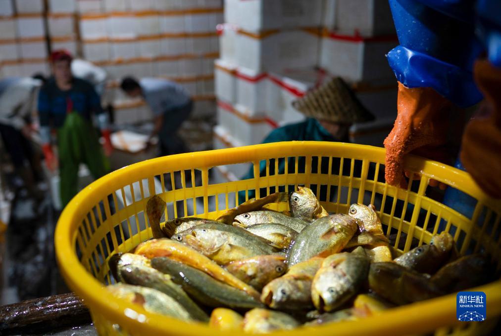 在寧德霞浦下滸海域漁排上拍攝的養殖戶(hù)夜捕的大黃魚(yú)(2021年11月25日攝)。
