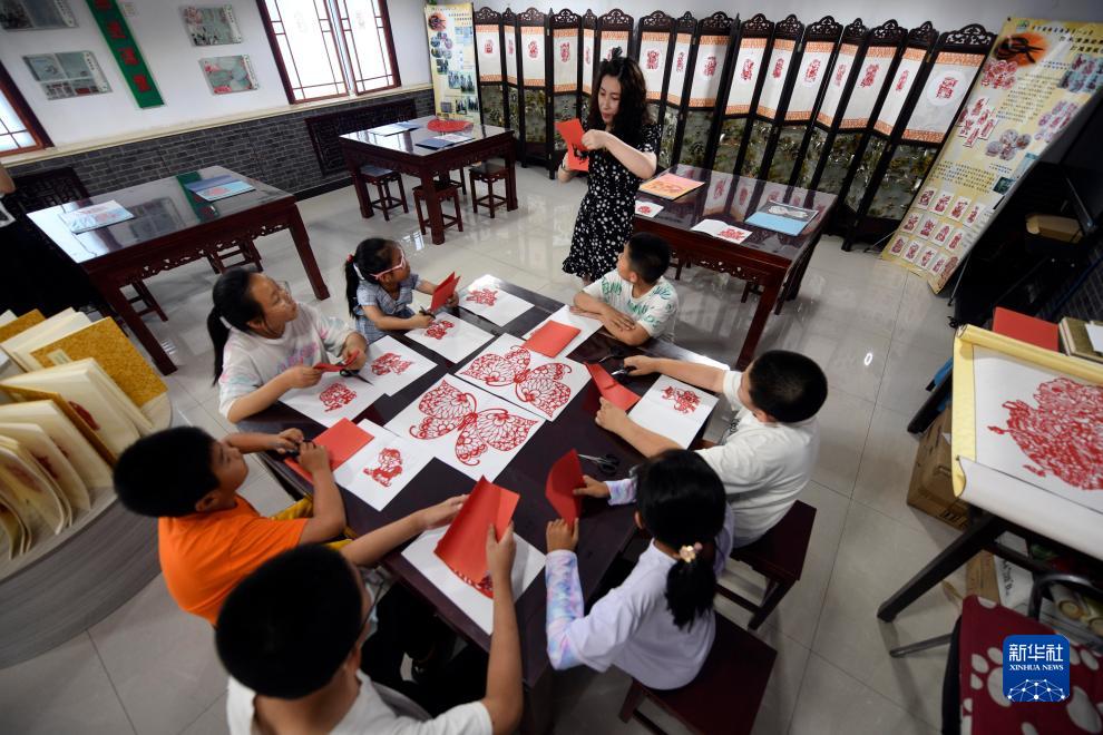 7月21日,在河北省豐寧縣暑假“非遺小課堂”,豐寧縣第一小學(xué)教師任洪茹為學(xué)生講解剪紙技藝。