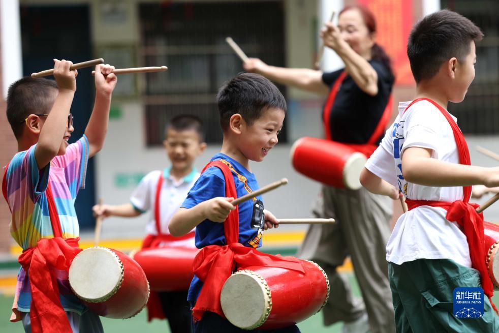 7月21日,在安徽省合肥市琥珀名城小學(xué)少年宮,孩子們練習打腰鼓。