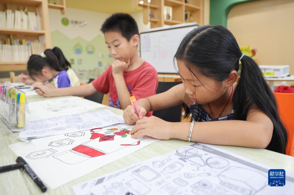 7月21日,在山東省臨沂市蘭山區銀雀山街道東苗莊社區暑假托管班,孩子們在學(xué)習繪畫(huà)。