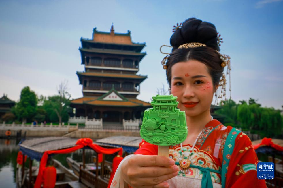 7月20日在山東省棗莊市臺兒莊古城拍攝古建筑造型文創(chuàng )雪糕。
