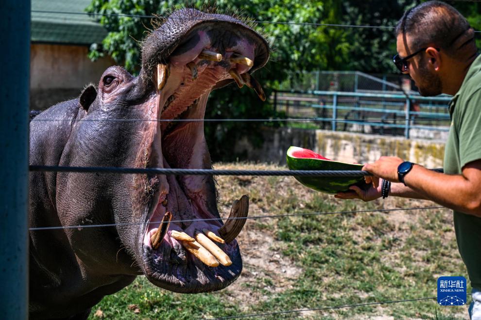 7月18日,在北馬其頓首都斯科普里一家動(dòng)物園,飼養員給河馬投喂西瓜。