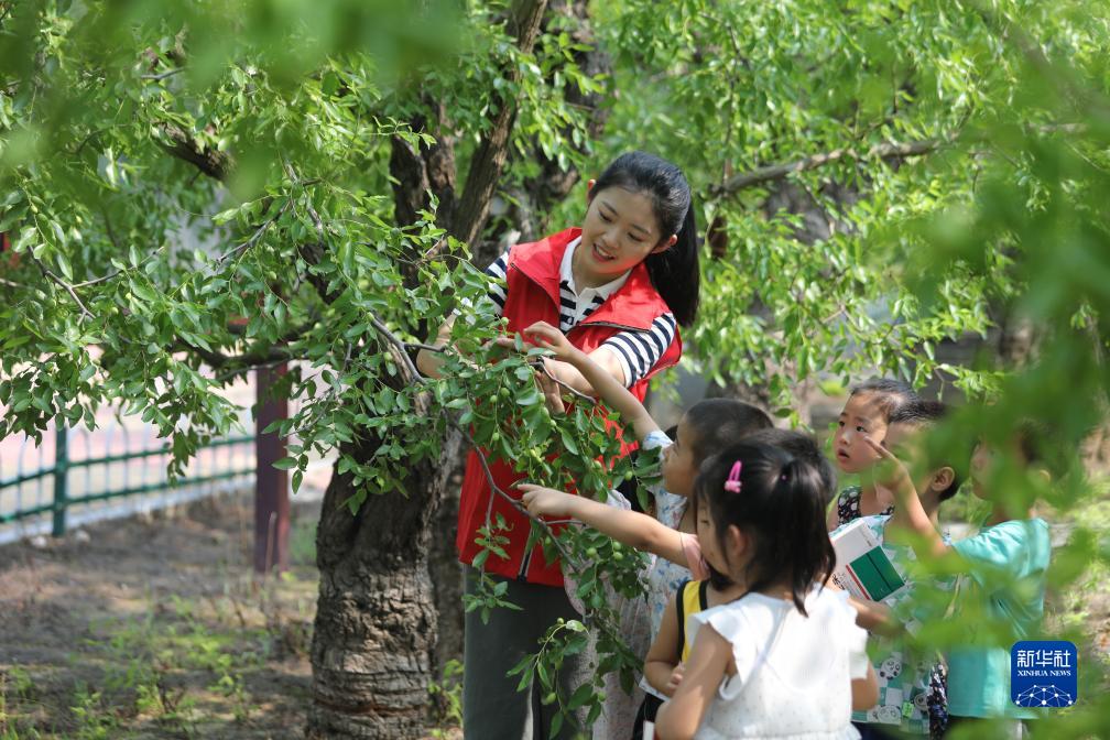 7月20日,志愿者在山東省樂(lè )陵市朱集鎮王雙志村棗園里和小朋友們一起上認識小棗實(shí)踐課。