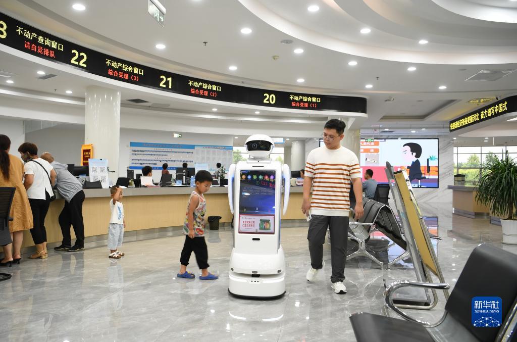 7月22日,河北省灤州市政務(wù)服務(wù)中心的機器人引導員在將辦事群眾帶到指定窗口。