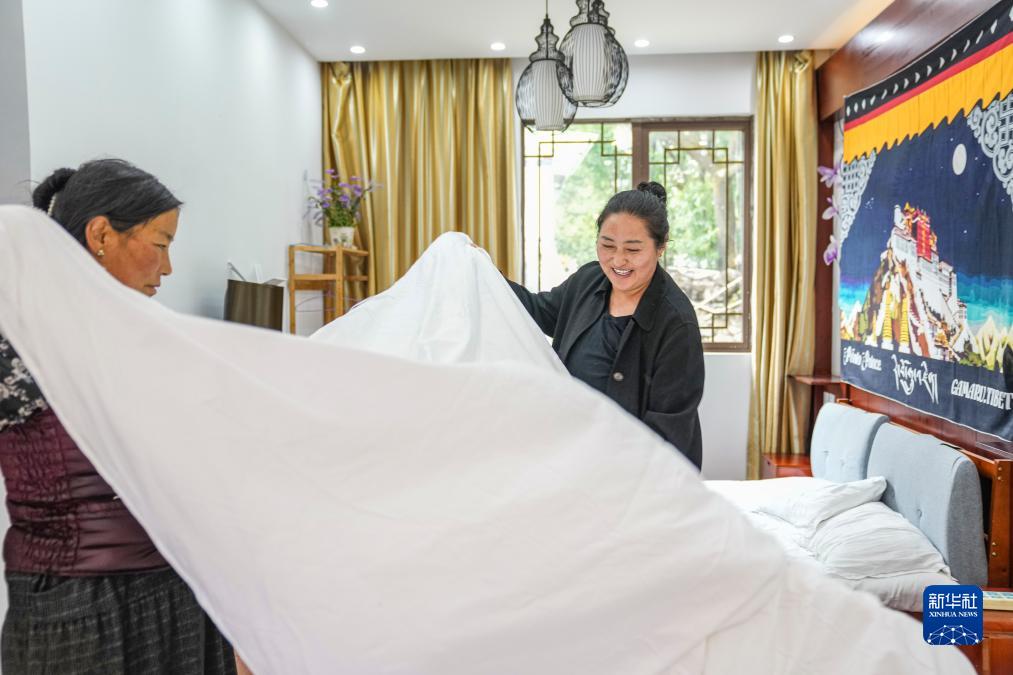 在結巴村的瑪尼石民宿,村民次仁德吉(右)和姐姐一起整理房間(7月20日攝)。