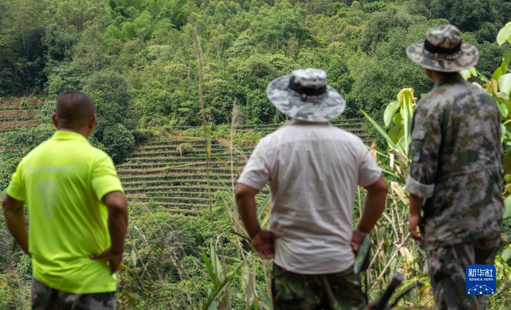 7月20日,刁發(fā)興(左)看著(zhù)遠處的一頭亞洲象。