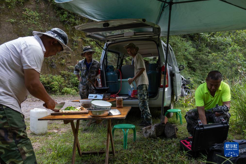 7月20日,刁發(fā)興(右一)收起無(wú)人機,準備和隊友做飯。