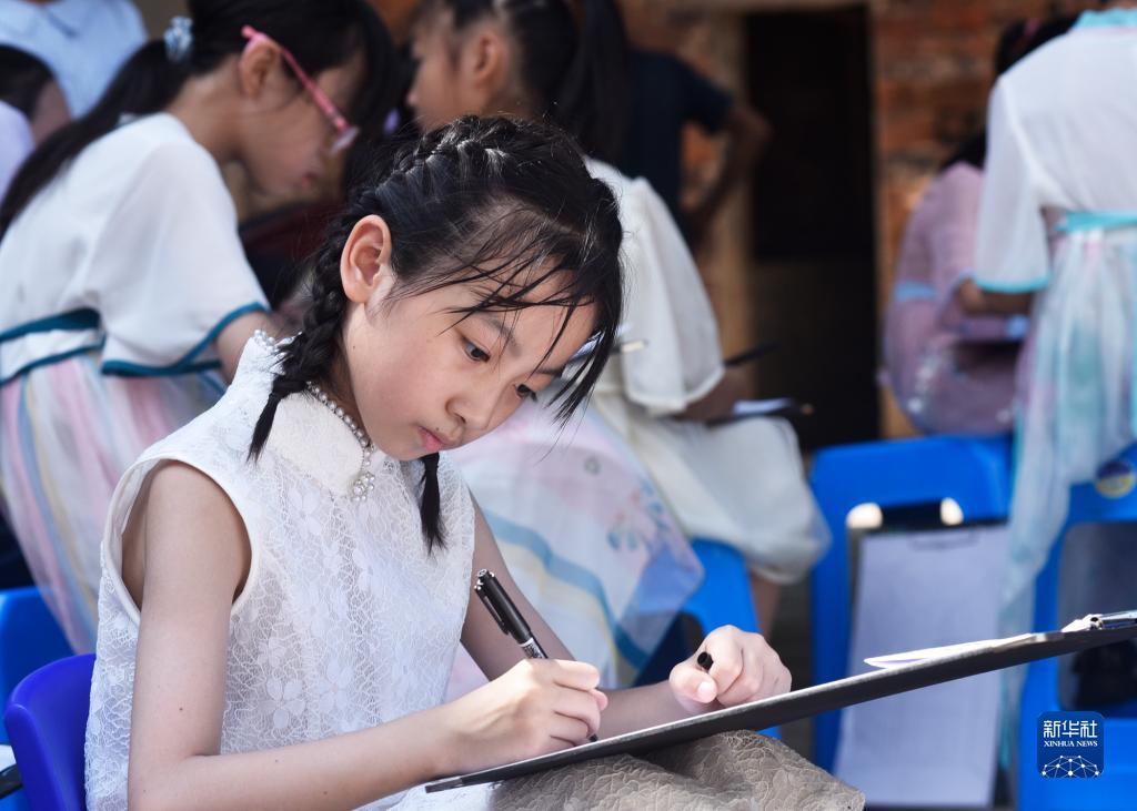 7月22日,在湖南省郴州市嘉禾縣晉屏鎮雷公井村,小朋友在寫(xiě)生。