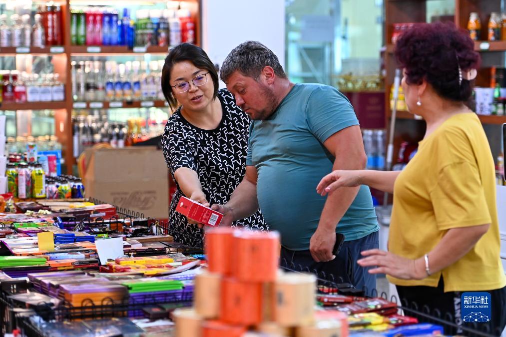 在新疆塔城巴克圖中哈邊民互市絲路文化商品城,一位哈薩克斯坦的游客在選購商品(7月22日攝)。