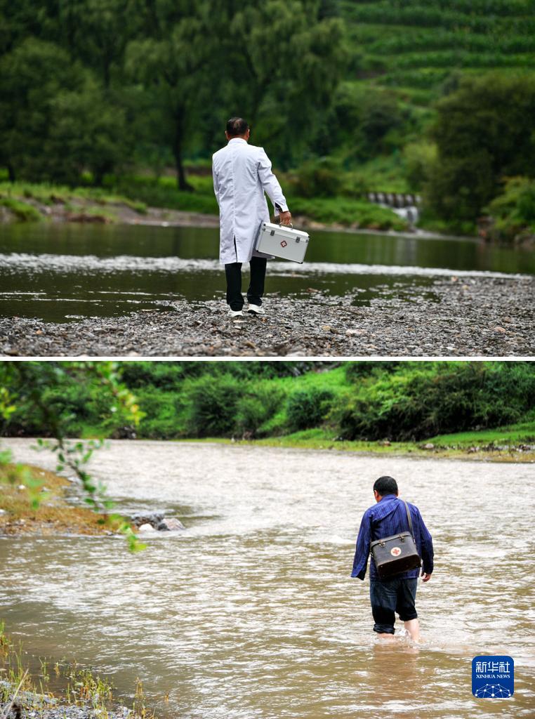 這是一張拼版照片,上圖為:2023年7月19日,朱大清出診時(shí)從馬擺河邊經(jīng)過(guò);下圖為:2012年7月5日,朱大清涉水過(guò)河去出診。