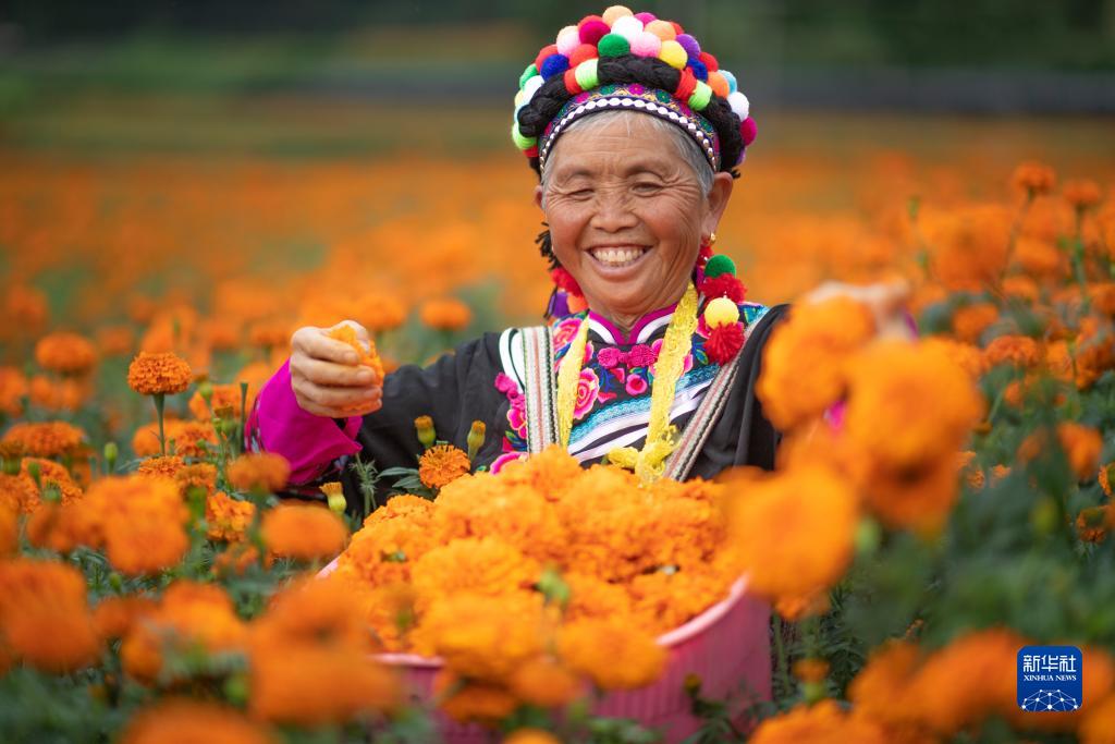 7月23日,云南省文山壯族苗族自治州馬關(guān)縣大栗樹(shù)鄉的一名婦女在采摘萬(wàn)壽菊。