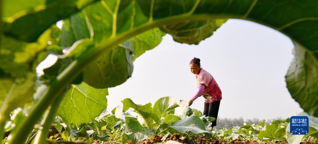 7月23日,在河北省石家莊市欒城區趙家莊村農田里,菜農在管護菜花苗。