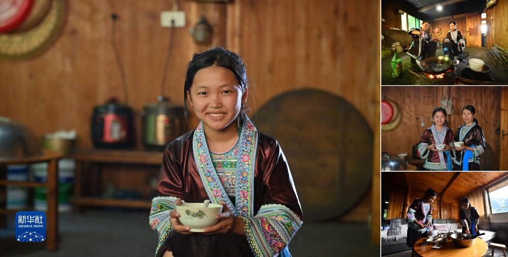 拼版照片:左圖為廣西融水苗族自治縣桿洞鄉堯告村11歲的小學(xué)生韋雪菲;右圖為韋雪菲跟著(zhù)媽媽學(xué)習打油茶(照片均攝于7月6日)。韋雪菲說(shuō),以前都是媽媽打油茶給她喝,這個(gè)暑假她一定要學(xué)會(huì )打油茶,然后打給媽媽喝。