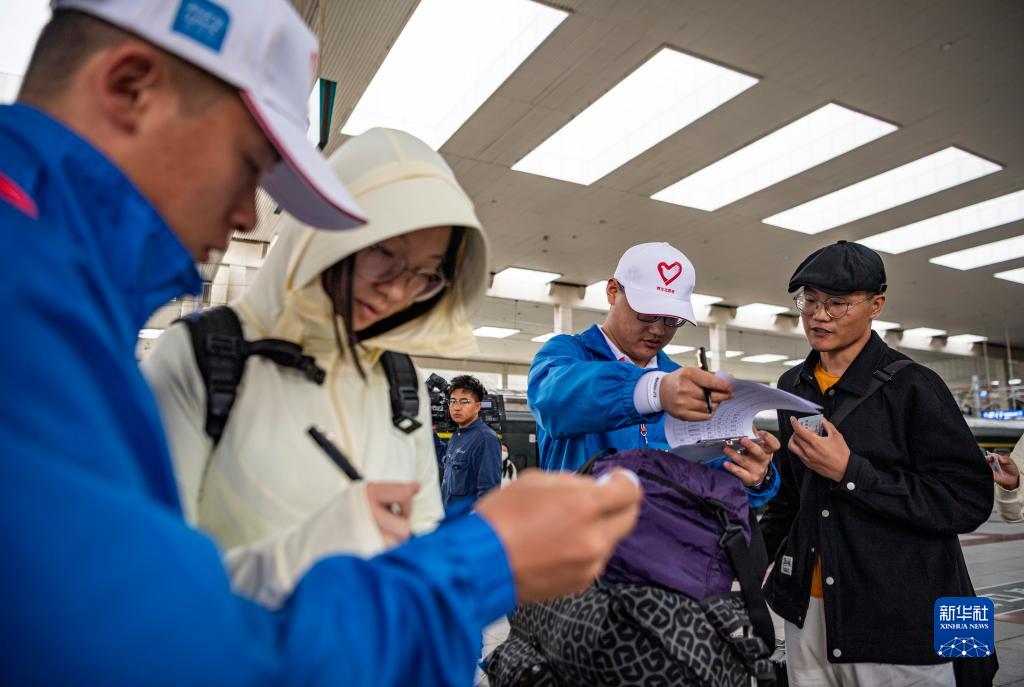 7月24日,在拉薩火車(chē)站,工作人員為抵達拉薩的志愿者登記信息。