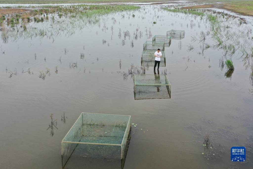 7月9日,中國科學(xué)院洞庭湖濕地生態(tài)系統觀(guān)測研究站科研人員巢傳鑫博士在湖南東洞庭湖國家級自然保護區查看種植的沉水植物生長(cháng)情況(無(wú)人機照片)。新華社記者 薛宇舸 攝
