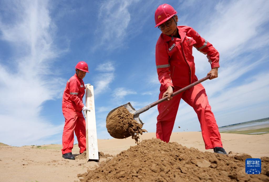 巡線(xiàn)隊員在巡線(xiàn)時(shí)重新栽埋傾斜的標志樁(7月23日攝)。