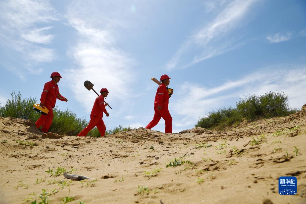 巡線(xiàn)隊員在巡線(xiàn)時(shí)穿越沙漠區域(7月23日攝)。