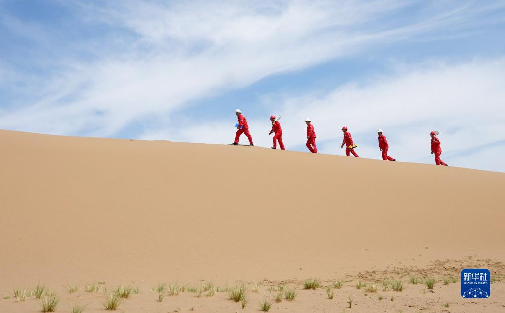 巡線(xiàn)隊員在巡線(xiàn)時(shí)穿越沙漠區域(7月23日攝)。
