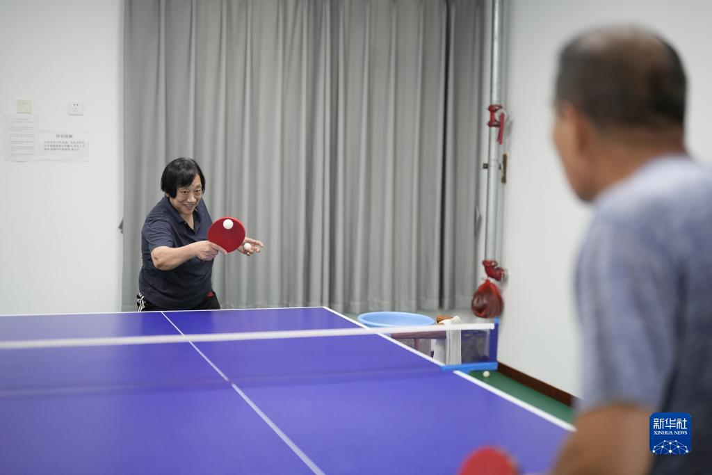7月25日,老年人在河北省唐山市路北區煤研分院社區養老服務(wù)中心打乒乓球。