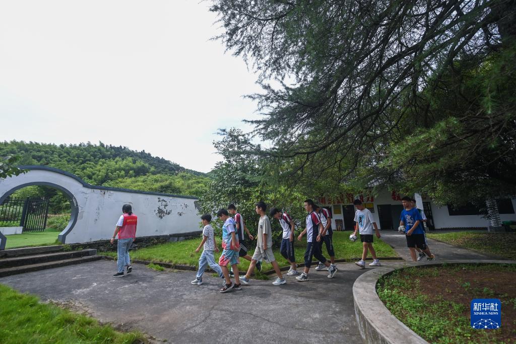 7月25日,在諸暨市馬劍鎮上和村的侯門(mén)山鄉村圖書(shū)館,暑托班的孩子們在志愿者老師的帶領(lǐng)下參加戶(hù)外活動(dòng)。