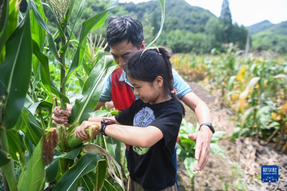 7月25日,在諸暨市馬劍鎮狀元村,暑托班的孩子們在農田里采收玉米,體驗農事。