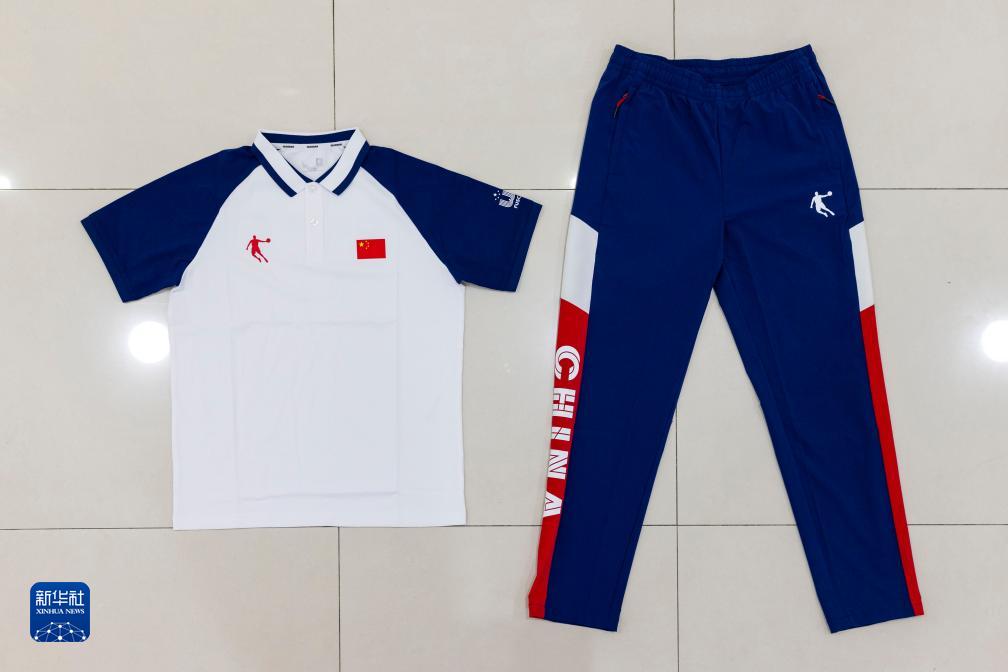 這是7月24日拍攝的第31屆世界大學(xué)生夏季運動(dòng)會(huì )中國代表團成員配發(fā)裝備中的POLO短T恤衫和長(cháng)褲。