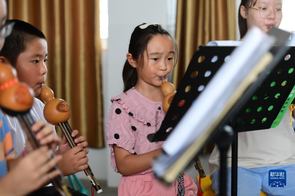 7月25日,孩子們在合肥市肥西縣紫蓬鎮中心學(xué)校少年宮學(xué)習吹奏葫蘆絲。
