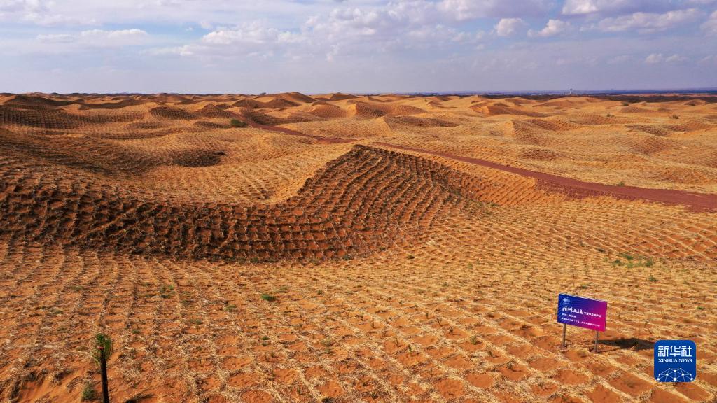 位于寧夏中衛市境內騰格里沙漠的杭州亞運會(huì )寧夏中衛防護林(7月19日攝,無(wú)人機照片)。