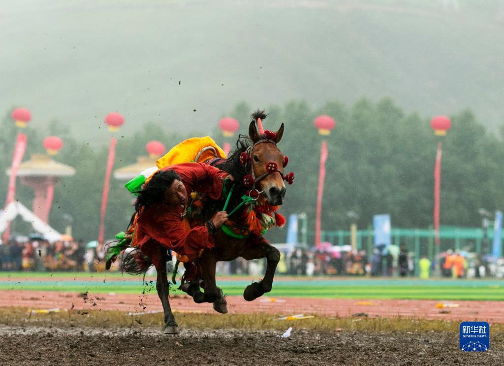 7月25日在玉樹(shù)賽馬場(chǎng)拍攝的跑馬拾哈達表演。