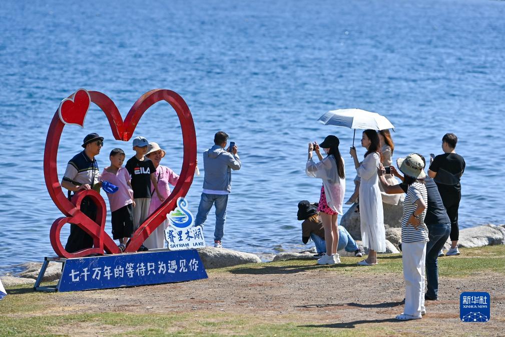 7月25日,游客在新疆賽里木湖景區拍照、留影。