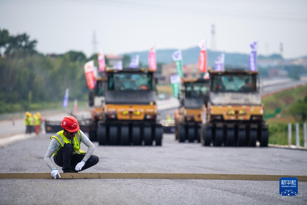 7月25日,在衡永高速路面工程施工現場(chǎng),工人在檢測瀝青攤鋪平整度。