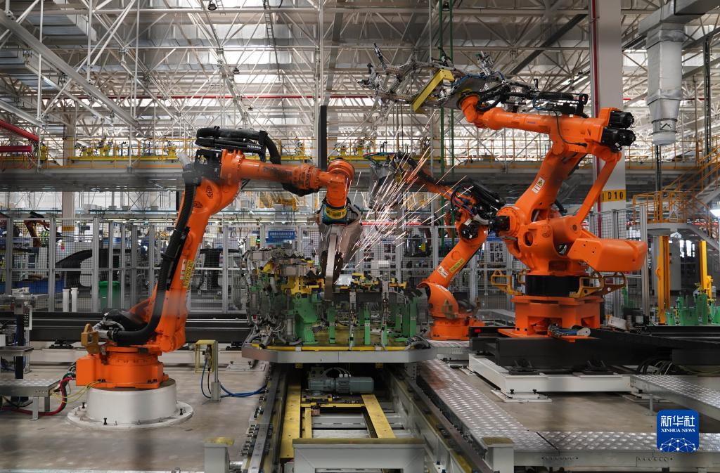 在位于江西省南昌市經(jīng)開(kāi)區的江鈴集團新能源汽車(chē)有限公司生產(chǎn)基地車(chē)間內,機器人在生產(chǎn)線(xiàn)上作業(yè)(7月18日攝)。新華社記者 周密 攝