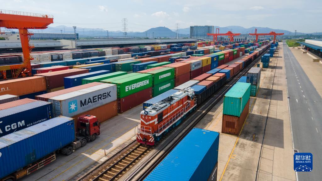 7月25日,在浙江省金華市華東國際聯(lián)運港,一輛“義新歐”中歐班列在海關(guān)監管下,裝載著(zhù)110個(gè)標箱日用百貨、家用電器、家裝材料等貨物,啟程駛向哈薩克斯坦(無(wú)人機照片)。新華社發(fā)(胡肖飛 攝)