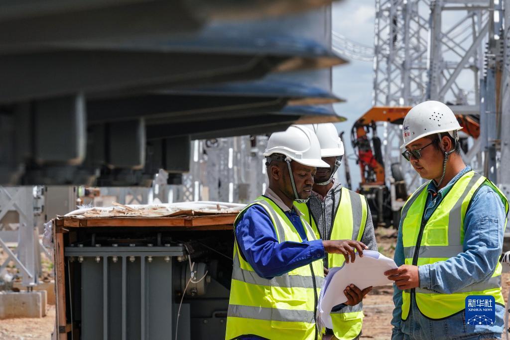 5月5日,在肯尼亞馬查科斯郡孔扎變電站建設工地,大衛(左)與同事溝通變壓器安裝情況。