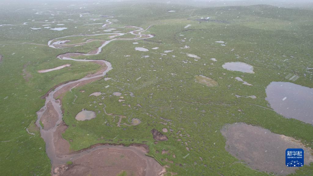 風(fēng)雪彌漫中的當曲濕地(7月24日攝,無(wú)人機照片)。