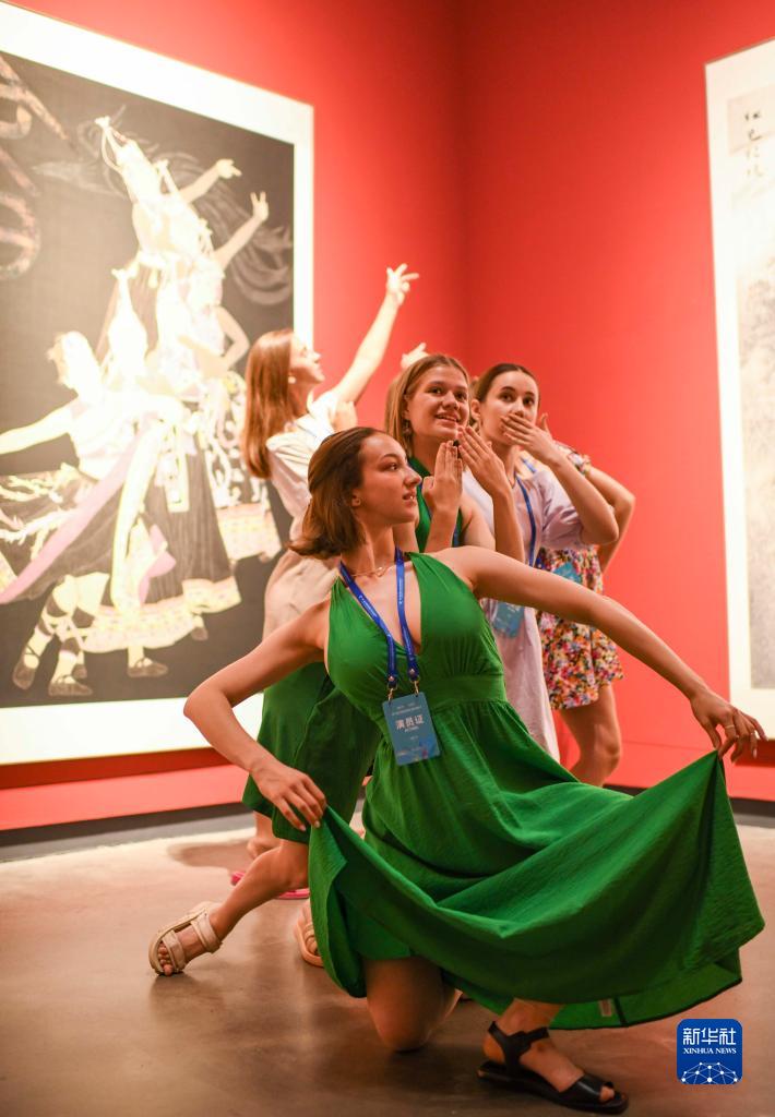 在新疆美術(shù)館,索菲婭(前)和隊友們在一幅名為《畬族歡歌》的畫(huà)作前留影(7月20日攝)。