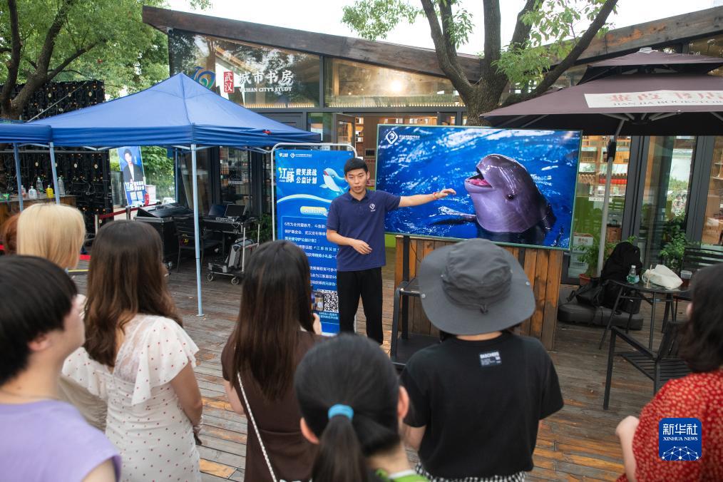 6月28日,科普講師何俊逸在武漢漢口江灘為市民做長(cháng)江江豚保護科普。
