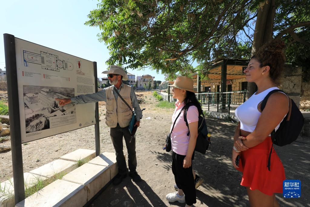 7月26日,在黎巴嫩巴勒貝克,一名導游在向游客介紹巴勒貝克神殿建筑群遺址。