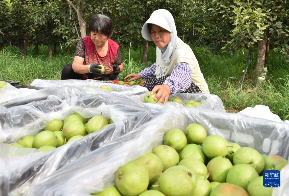 7月27日,河北省威縣張營(yíng)鄉前花疃村果農在梨園分揀采摘的梨果。
