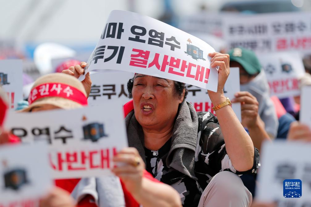 7月26日,在韓國全羅南道寶城郡沿海一帶,韓國漁民手持標語(yǔ)參加集會(huì )活動(dòng),抗議日本核污染水排海。