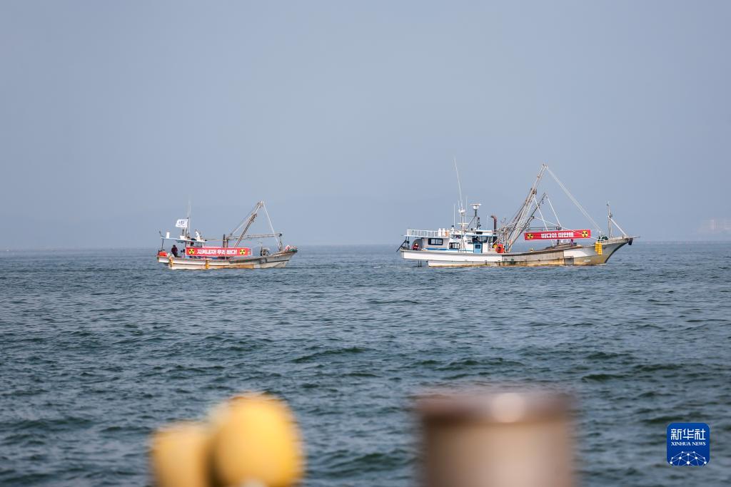 7月26日,在韓國全羅南道寶城郡沿海一帶,韓國漁民在集會(huì )活動(dòng)上駕駛漁船懸掛標語(yǔ),抗議日本核污染水排海。