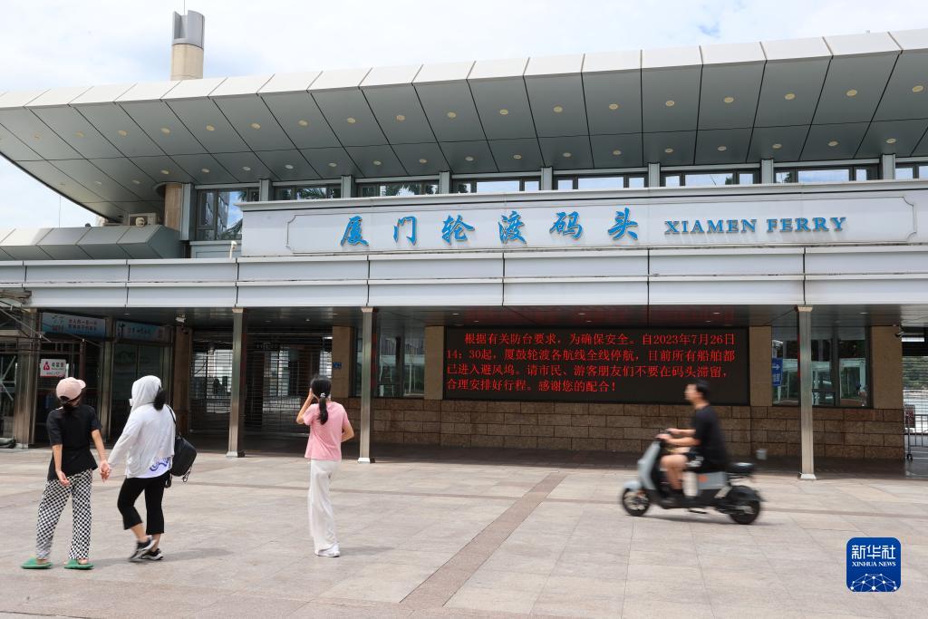 福建廈門(mén)輪渡碼頭電子顯示屏向游客提示受臺風(fēng)影響有關(guān)停航的信息(7月27日攝)。
