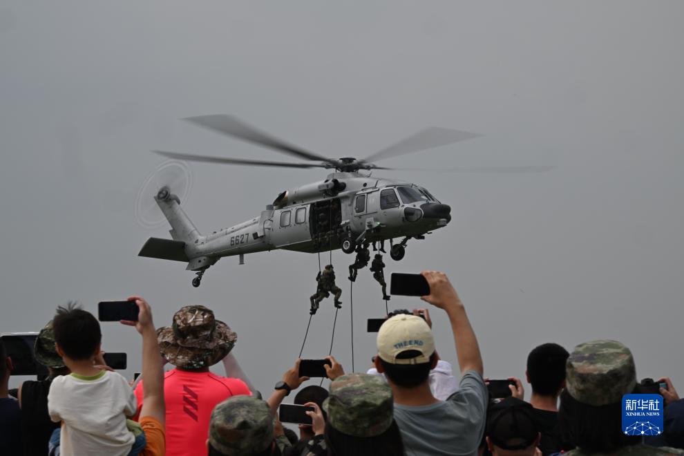 7月27日,在空軍航空開(kāi)放活動(dòng)·長(cháng)春航空展首個(gè)公眾日,觀(guān)眾觀(guān)看空降兵空中突擊分隊救援行動(dòng)展示。
