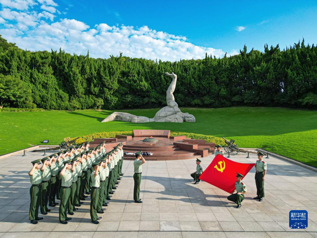 武警上??傟牂C動(dòng)第一支隊“天德山英雄連”官兵在上海龍華烈士陵園無(wú)名烈士紀念碑前重溫入黨誓詞,緬懷先烈、銘記歷史(7月25日攝)。