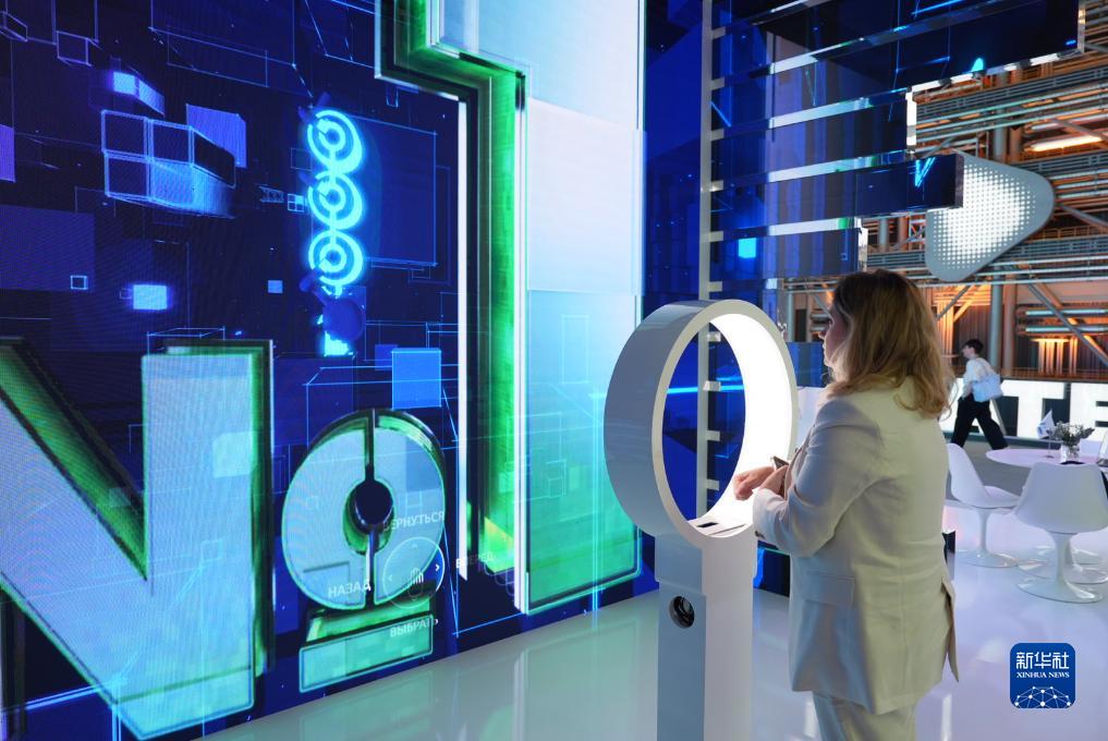 7月27日,在俄羅斯圣彼得堡,一名觀(guān)眾在俄非峰會(huì )會(huì )場(chǎng)體驗用手勢操控顯示屏。