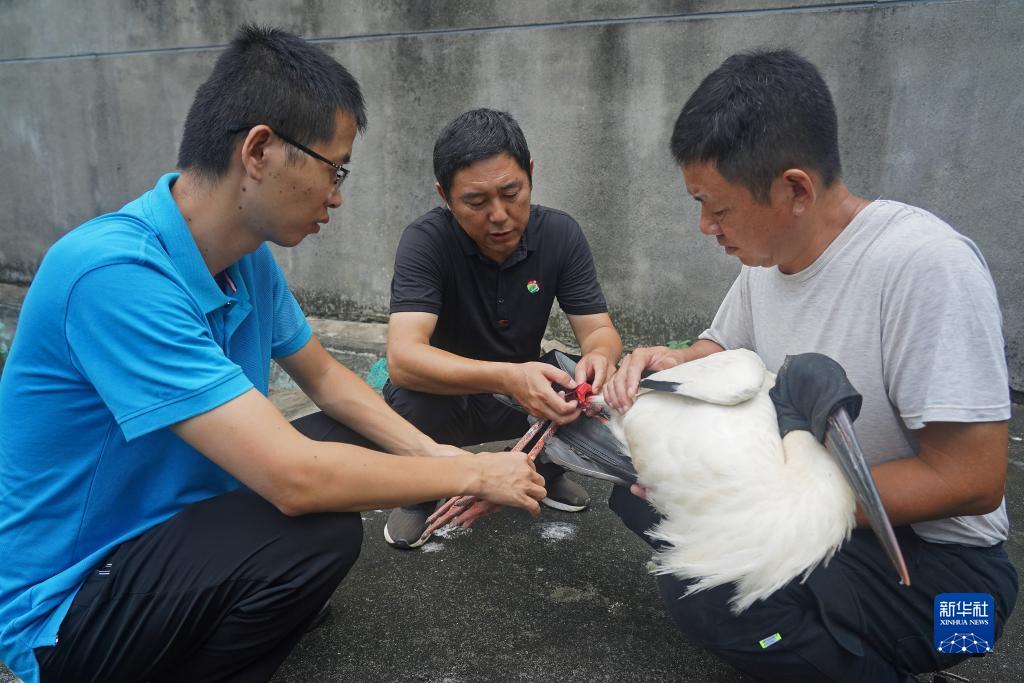 在江西省野生動(dòng)物救護中心,汪志如(中)和工作人員一起為一只即將放飛的東方白鸛佩戴調整GPS跟蹤器(7月20日攝)。