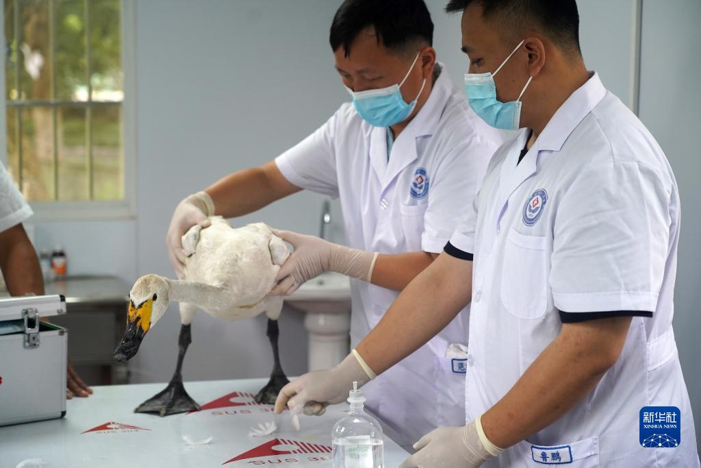 在位于江西省永修縣的江西鄱陽(yáng)湖國家級自然保護區吳城保護站,工作人員在為一只被救助的小天鵝進(jìn)行體檢(7月15日攝)。