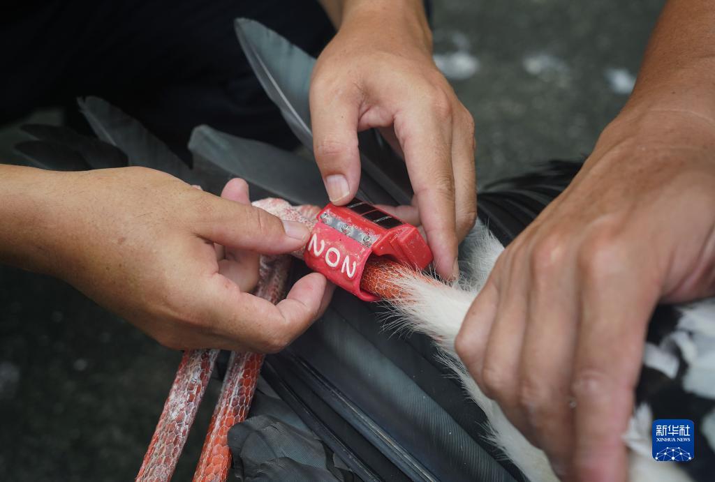在江西省野生動(dòng)物救護中心,工作人員在為一只即將放飛的東方白鸛佩戴調整GPS跟蹤器(7月20日攝)。
