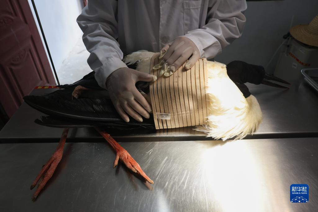 在江西省野生動(dòng)物救護中心,工作人員在給東方白鸛做體檢(7月16日攝)。