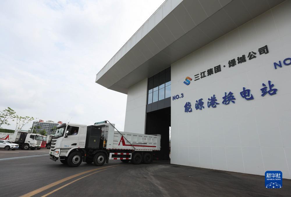 這是2023年6月29日在四川省宜賓市三江新區東部產(chǎn)業(yè)園能源港拍攝的重卡換電站。換電站內搭載7塊電池,單日24小時(shí)循環(huán)換電,最高可達168次,可滿(mǎn)足50輛電動(dòng)重卡換電需求。